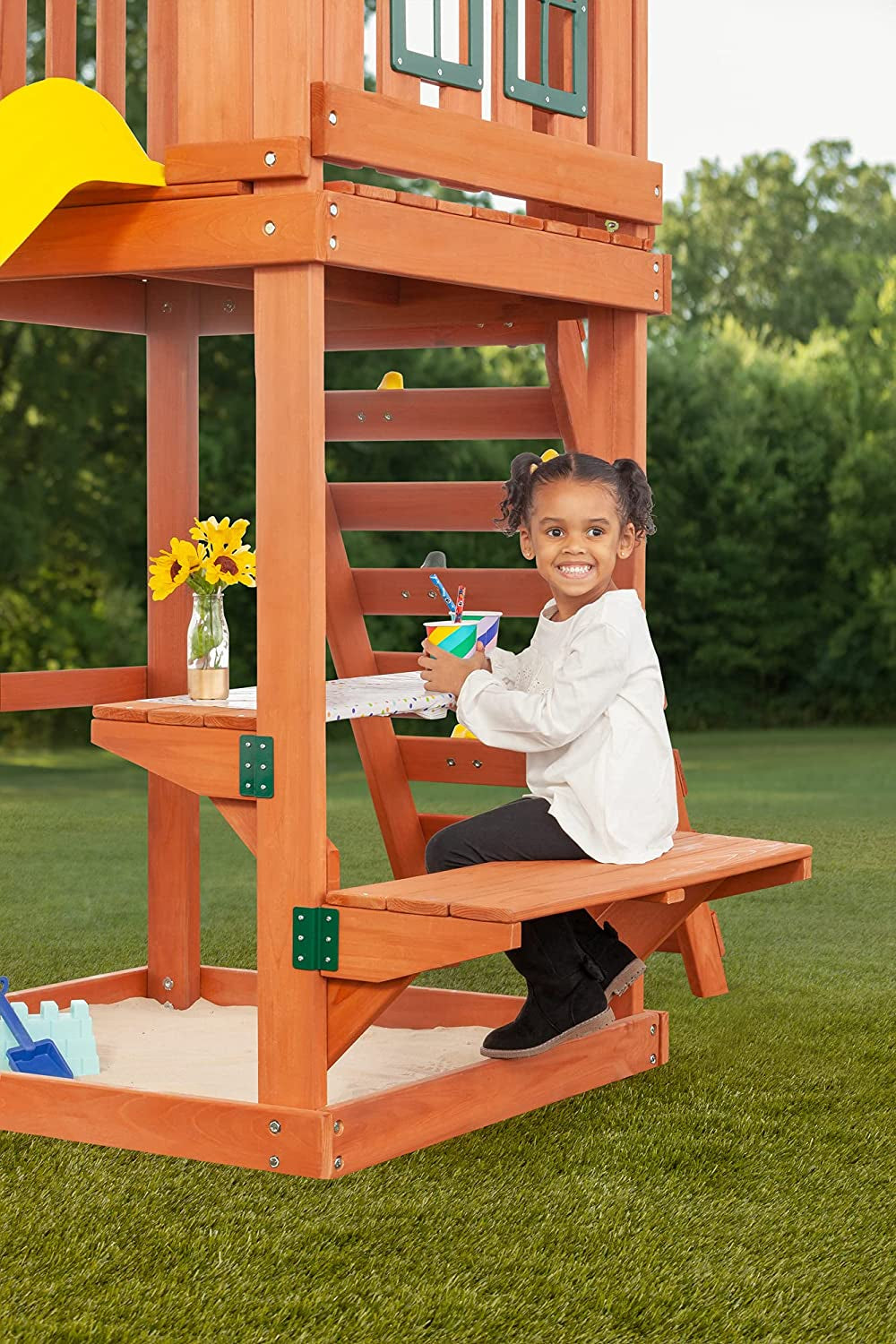 Swingset FortPlay Tower with Steering Wheel is the perfect place to sail to distant lands | SlideFeel the Wind in your Hair as you Race down the slide | Rock Climbing WallBuild strong arms while going on a Rock Climbing Adventure! | Picnic TableA great place for a picnic, tea party, or crafts |