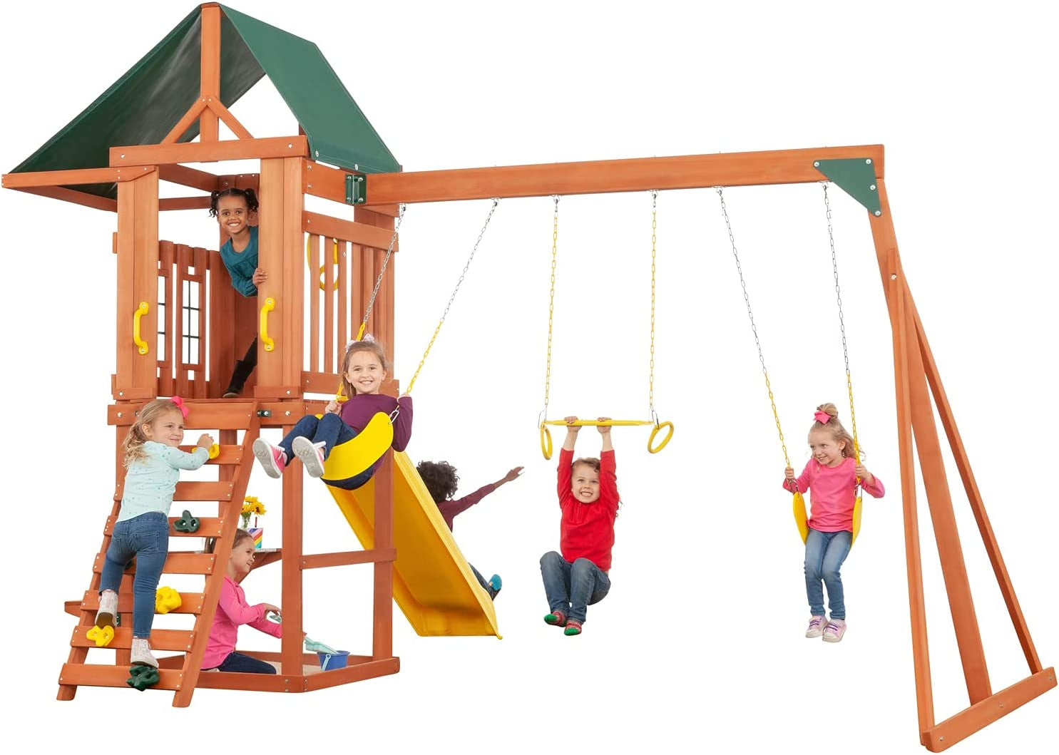 Cedar Cottage Wooden Backyard Playset | W: 163" D: 137" H: 114" | W/ 2 Belt Swings & Trapeze | Kids Age 3-10 | Sandbox, Slide & Climbing Wall | DIY Assembly | ASTM Standards | 10-Year Warranty on Wood