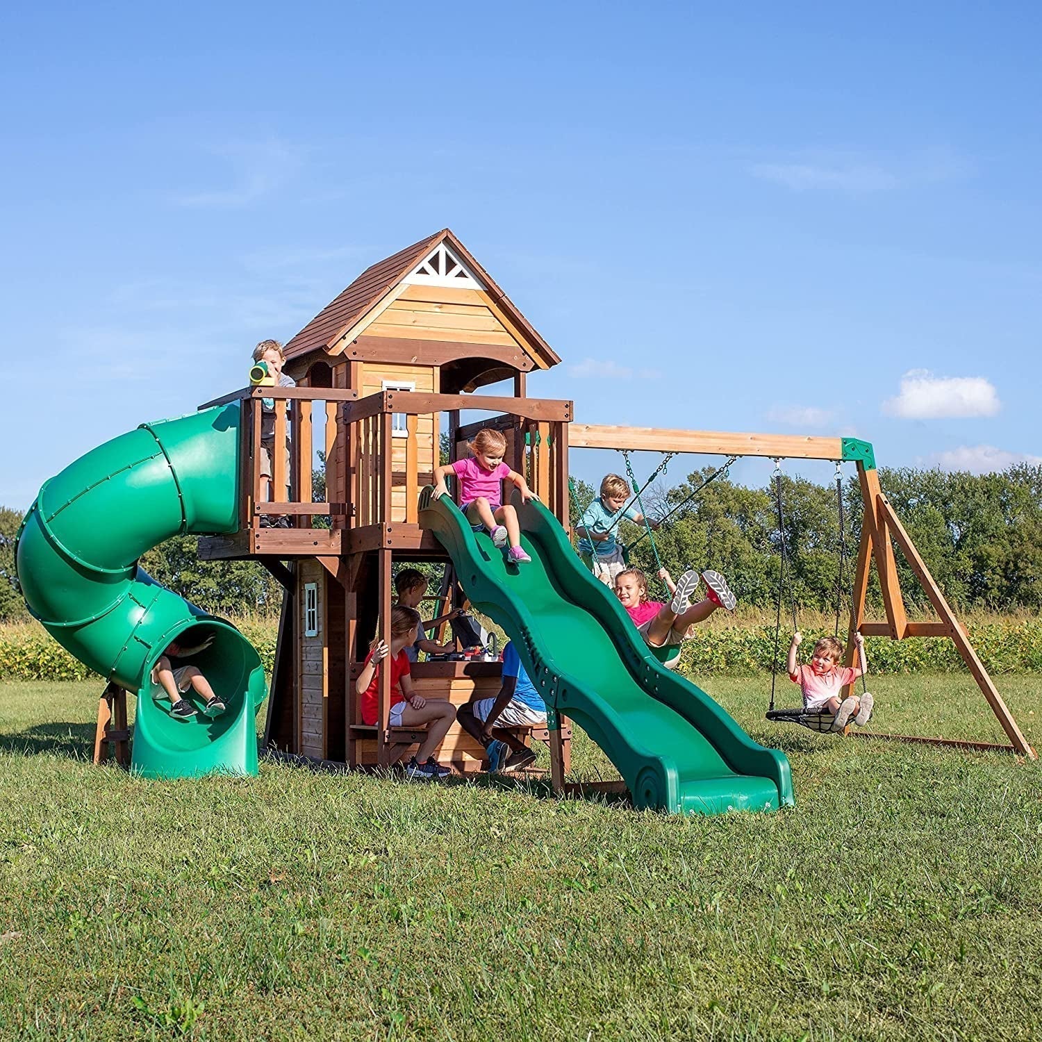 Boredom is never an option with the Cedar Cove Wooden Swing Set by Backyard Discovery. This swing set is action packed with a full assortment of play features perfect for any sized yard. Our unique feature combinations are not typically found on traditional swing sets such as our side-by-side 5 ft challenging rock wall and step ladder, our high-quality web swing and dual slide configuration featuring both a spiral tube slide and 10 ft. wave slide. Our step ladder features flat step rungs making entry into a fun filled upper clubhouse easy for any size of foot, the extra-long metal safety handles provide extra convenience for your child and peace of mind for you. Once they’ve made it into the upper fort, they’ll enjoy drawing on our built-in chalkboard, spotting friends through the built-in pretend telescope or hanging out on the lookout balcony. The 3-position swing beam is equipped with our patented swing beam extender offering wider swinging lanes and a safer experience for everyone. Outdoor play will never be the same with the Backyard Discovery Cedar Cove wooden swing set.