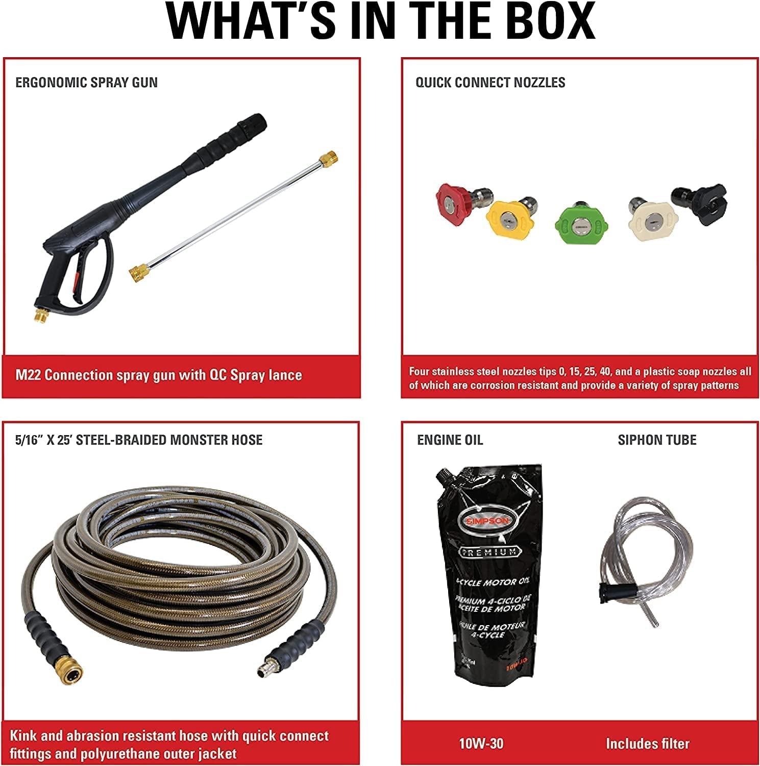 - Includes Quality Simpson Accessories: Monster 5/16-inch x 25-foot high-pressure hose is kink- and abrasion-resistant; 5 Quick connect nozzle tips: 0°, 15°, 25°, 40° and Soap; 16-inch steel wand/lance; Professional spray gun with safety lock-out