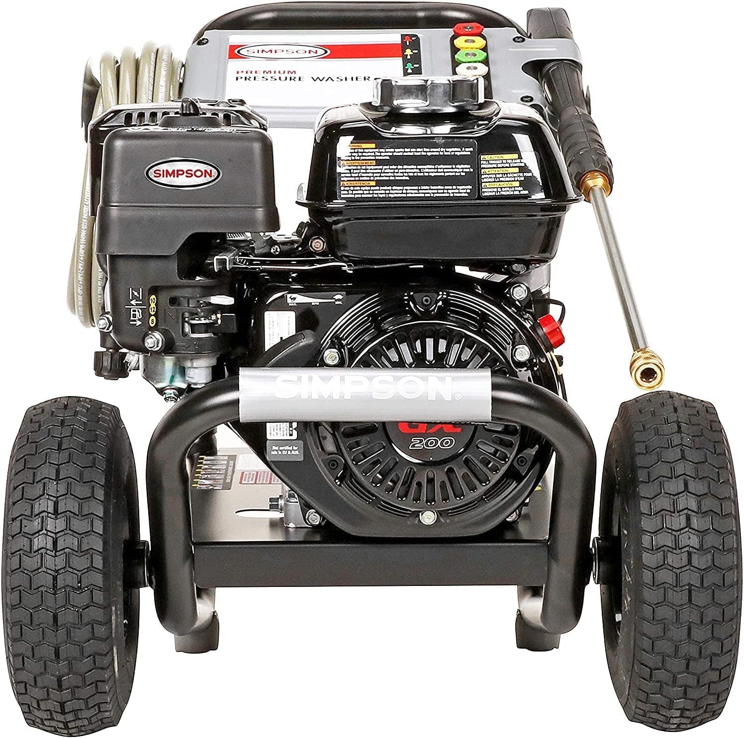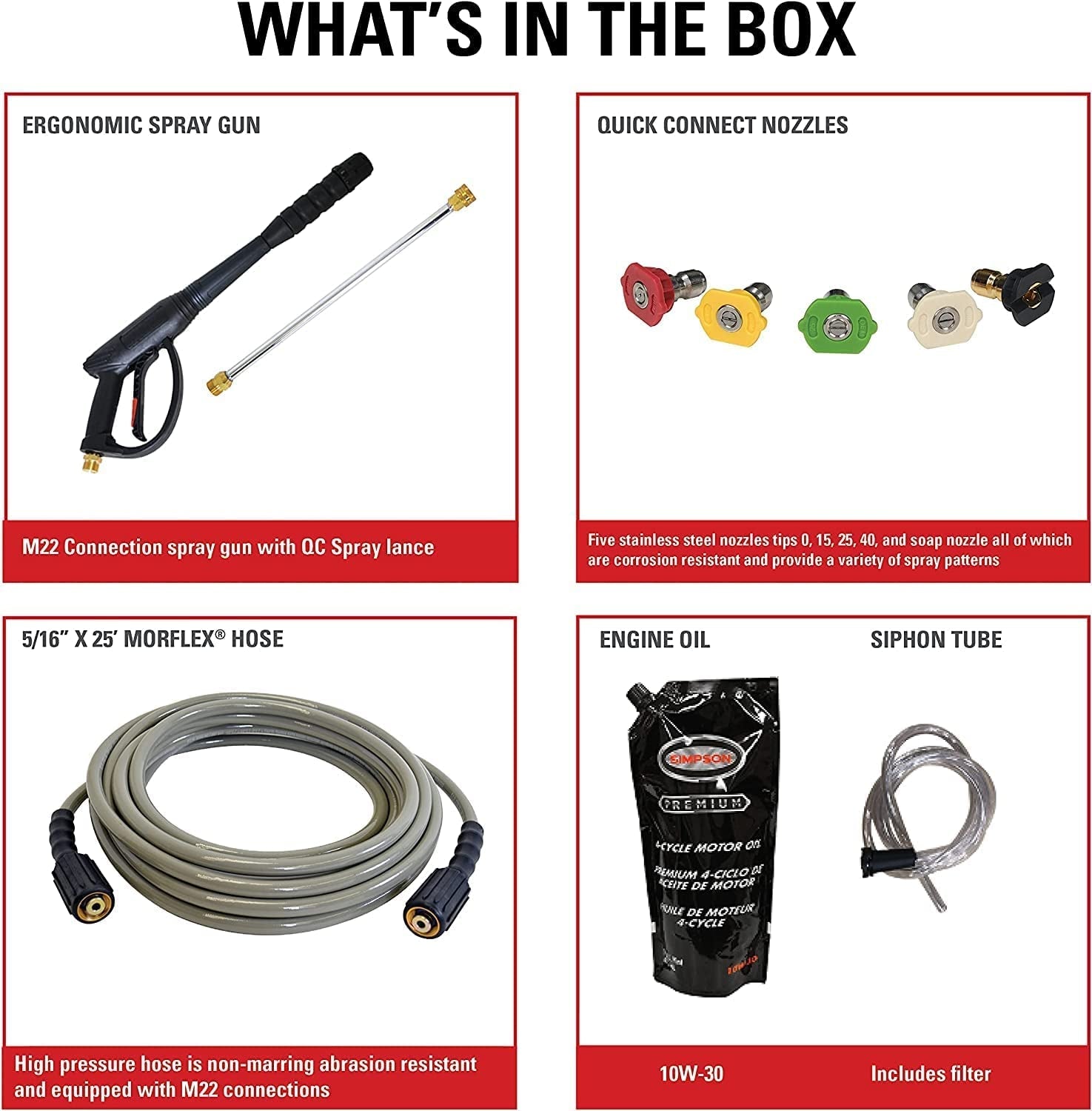 - Includes Quality Simpson Accessories: MorFlex 5/16-inch x 25-foot high-pressure hose is kink- and abrasion-resistant; 5 Quick connect nozzle tips: 0°, 15°, 25°, 40° and Soap; Ergonomic spray gun 16-inch steel wand/lance