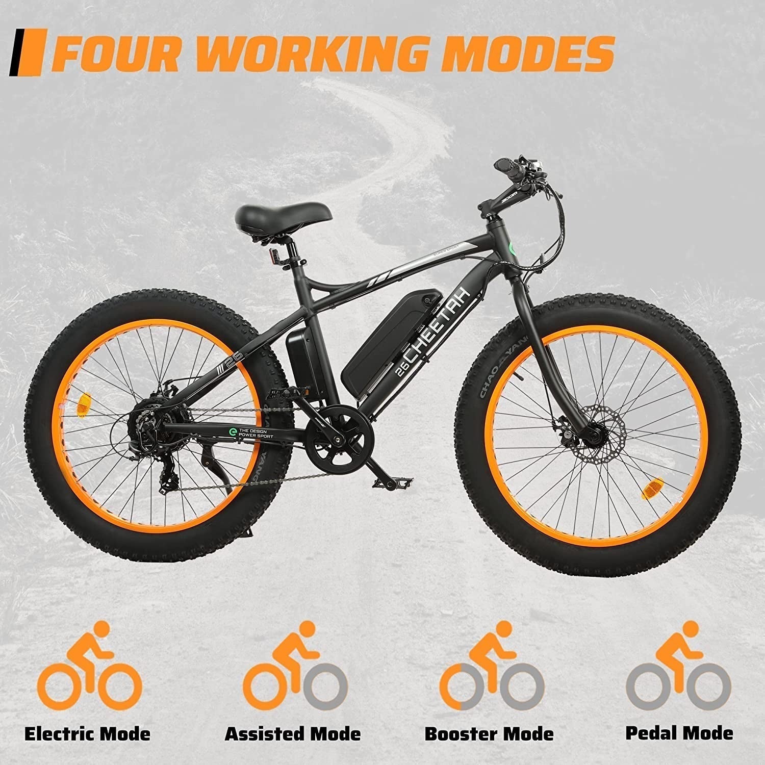- 4 WORKING MODES- A powerful and cost-effective mountain e-bike. 1. Pedal Assist Mode: The motor will assist you with a moderate amount of power as you pedal the bicycle. 2. Fully Electric Mode: Twist the throttle in any increments of power you desire to power the motor of the bicycle. 3. Pedal Mode: Pedal the bicycle normally as you would any bicycle. 4. Booster Mode: The Ebike will travel at 6 km/ h (3.73miles/h), easy to push.