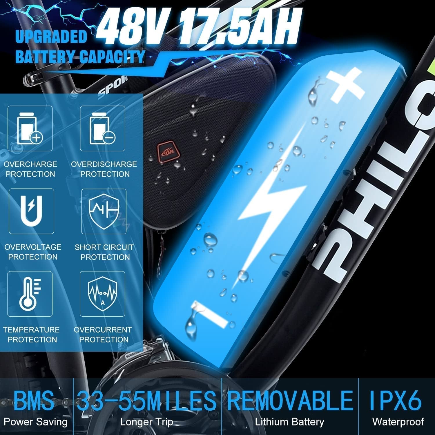 PHILODO Electric Bike for Adults 26'' Fat Tire Electric Bike 48V 17.5Ah Removable Battery Ebike Shimano 21-Speed Electric Mountain Bike