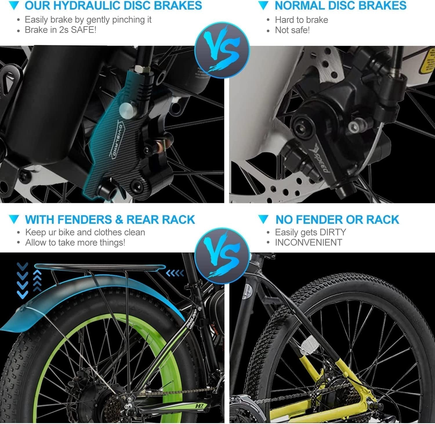26*4.0'' FAT TIRESThis upgraded PHILODO ebike uses 26*4.0'' fat tires, which meets all your riding conditions, whether it's flat road, snow road, mountain road and etc. | 1000W POWERFUL MOTORWith 1000w high speed brushless geared hub motor, our electric bike can easily speed up to 31MPH, offering ur a faster and enjoyable trip. | HYDRAULIC DISC BRAKESFront and rear Hydraulic Disc Brake possesses a strong and responsive braking force by gently pinching it in different conditions, offering u a safer ride. | FULL COVER FENDERS& REAR RACKEvery riding may bring up dirt from the tires to ur clothes. To solve this issue, we have added Full Cover Fenders for both tires. The rear rack with 110lbs capacity allows u to bring enough supplies on ur journey. |
