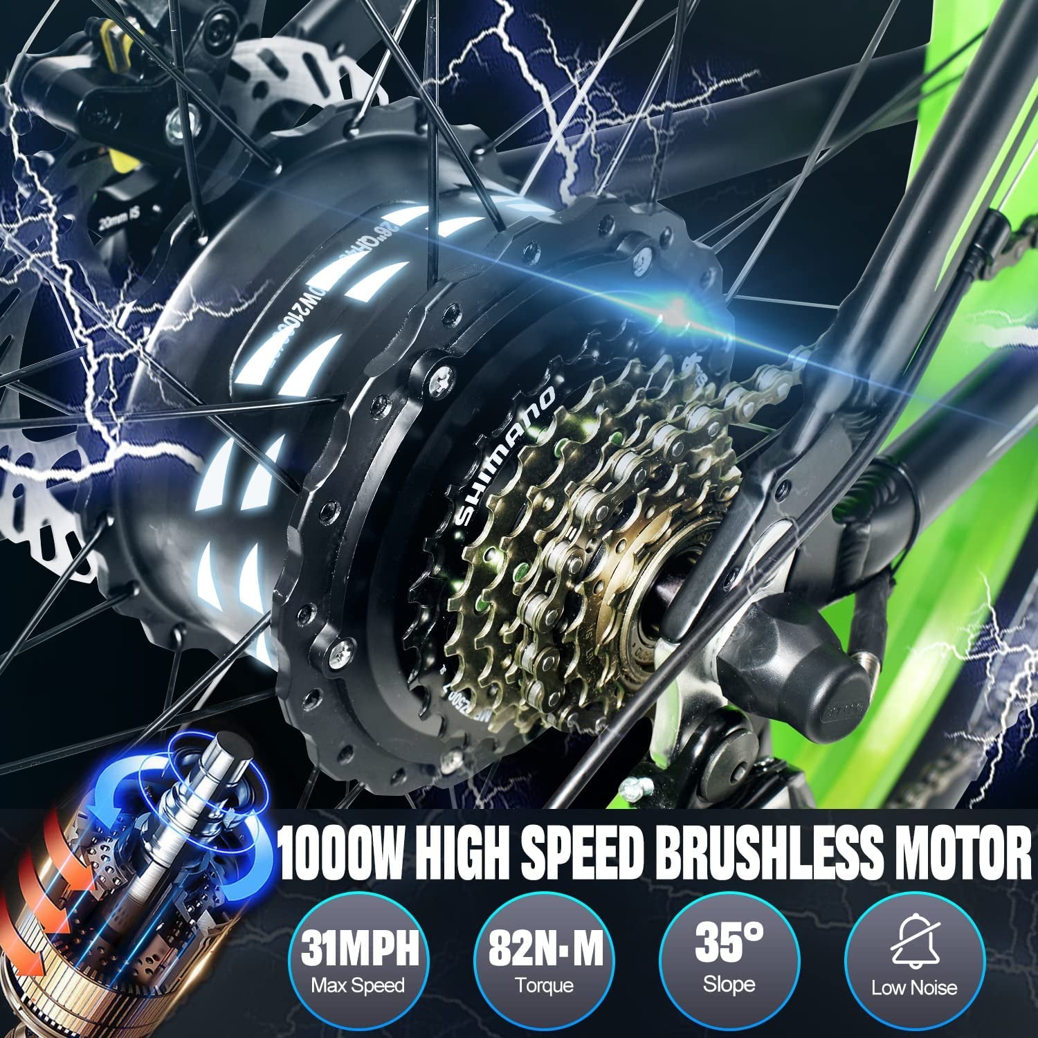 - 🚴♀️【Shimano Electric Bicycle】Equipped with 1000W high speed brushless motor, providing electric bikes strong power and climbing capabilities, assists the speed up to 31MPH. With Shimano 21-Speed Gear, our ebike will take u anywhere freely whether it’s snow, beach, mountain or city roads.