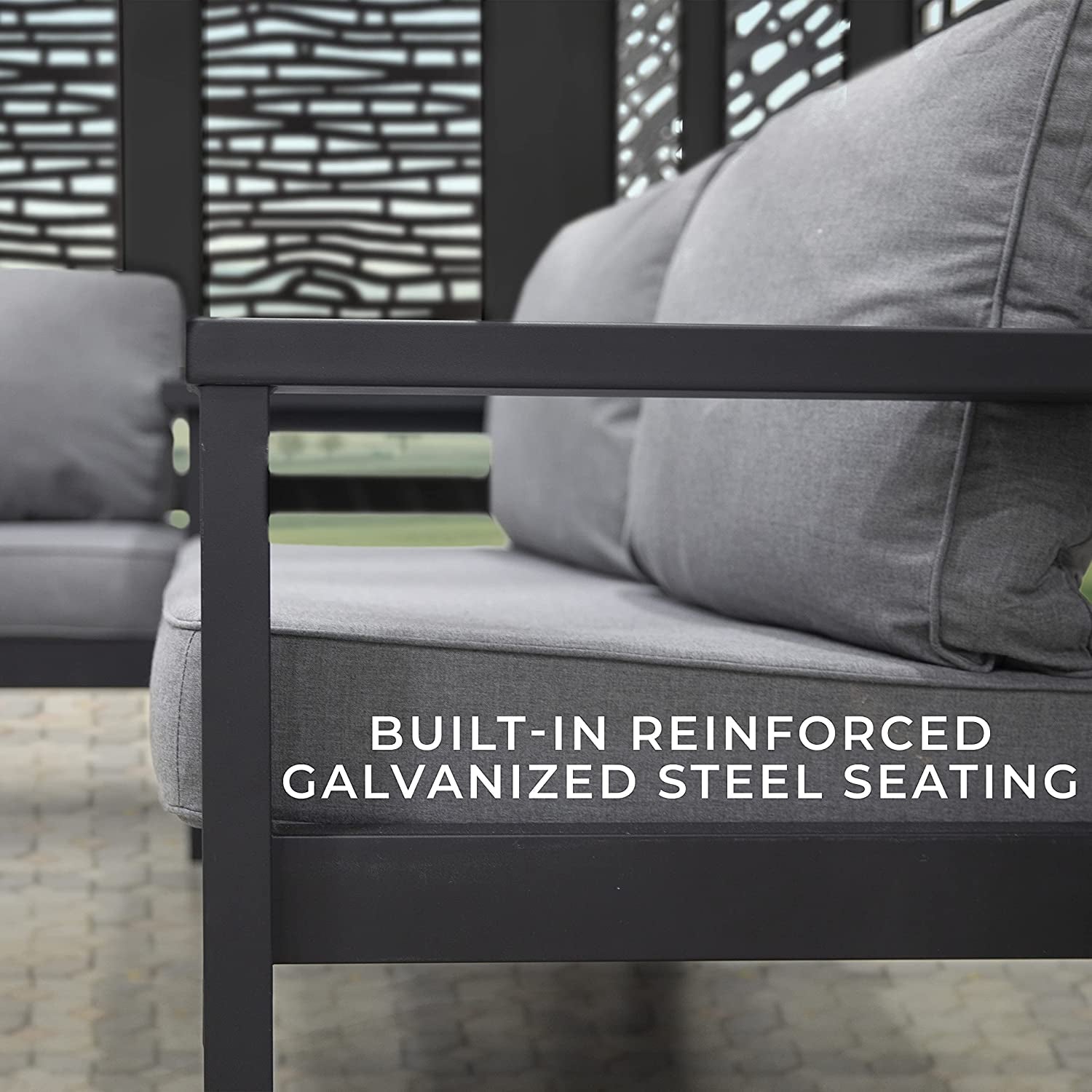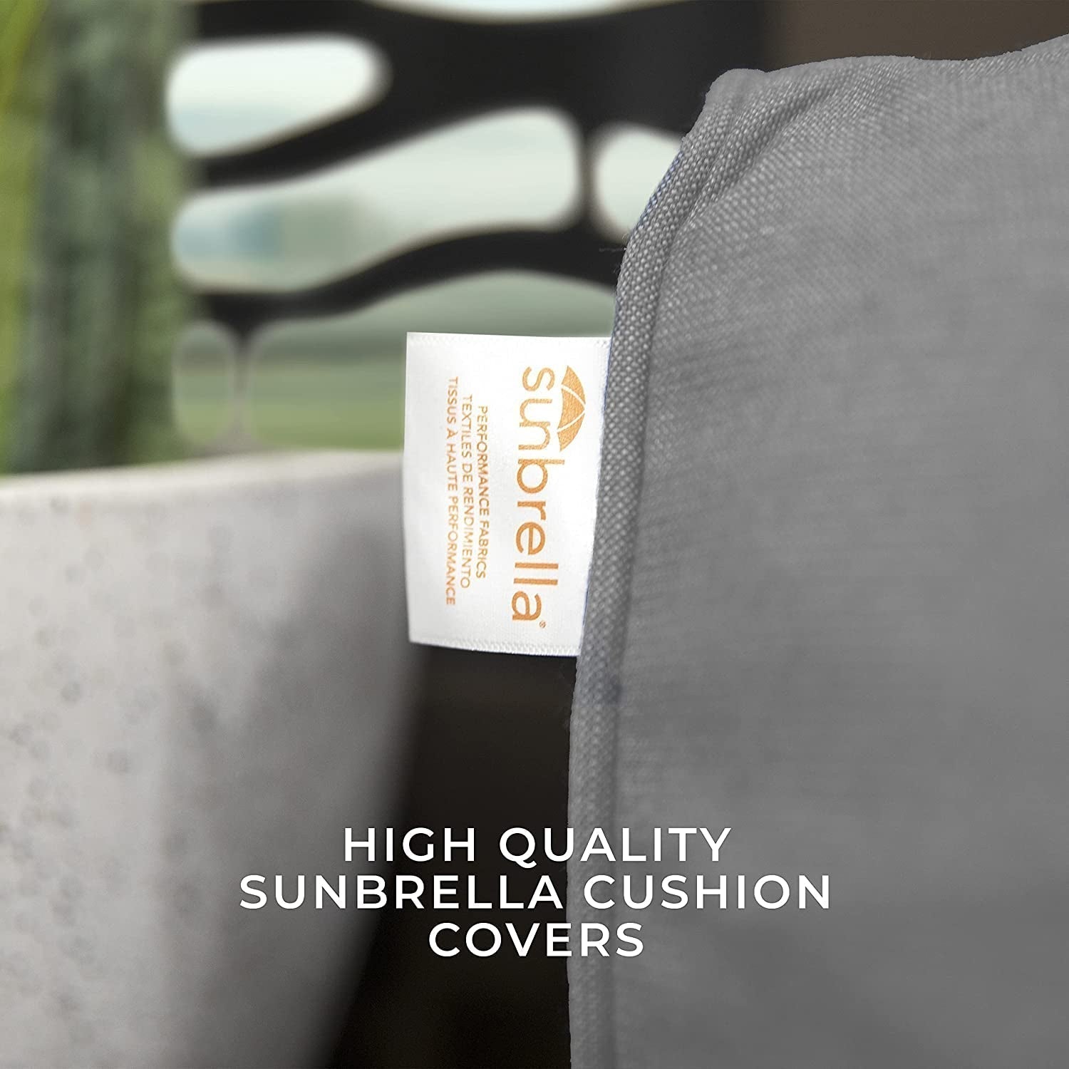 - Built-In and reinforced galvanized steel furniture frame and side table. Sunbrella cushions provide comfortable, best-in-class outdoor fabric performance.