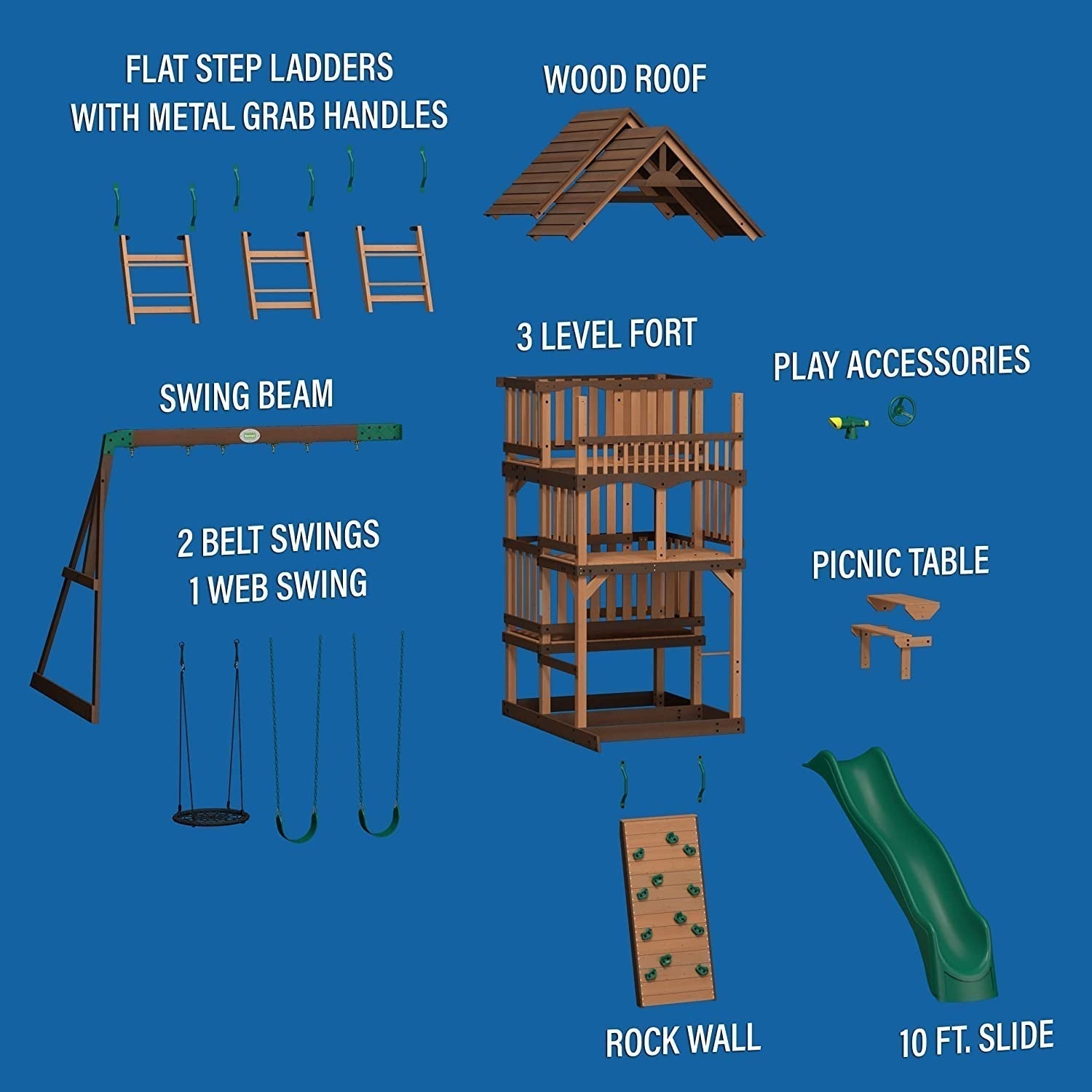 Three levels of multi-story playing fun? Yes please! Dreams do come true thanks to the Highlander all cedar wooden swing set by Backyard Discovery! Complete with 2 heavy duty belt swings, a web disc swing, a rock wall and a 10-foot speedy wave slide; the Highlander will transcend your littles into an imaginary world of outdoor play. The snack bar and picnic table provide a breath catching resting spot before the kiddos climb up the rock wall or use the wide step ladders to escalate up levels to reach the included telescope for a look out. Inducing hours of enjoyment, the Highlander wooden swing set encompasses everything you’re looking for in backyard merriment! For over 30 years, Backyard Discovery has been producing the highest quality wooden swing sets, playhouses and backyard leisure products for the home. Our team of innovators and specialists are passionate about bringing our love of quality family moments to your backyard. We are everyday parents just like you, while also expert craftsmen with a long legacy of building great products for millions of customers. We strive to take kids outside (just like we were) where they can flex both their muscles and their minds.