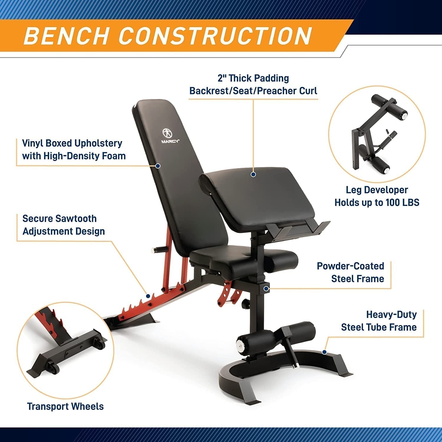 The included adjustable bench has a saw-tooth adjustment for the back pad so you can quickly and securely switch between incline, flat, and decline positions. For your comfort, the seat pad portion also has 4 different adjustment angles. For your convenience, the transport wheels make it easy to move the bench around as necessary for your workouts. Finally, the preacher curl pad and leg developer are detachable to make space for different workouts.