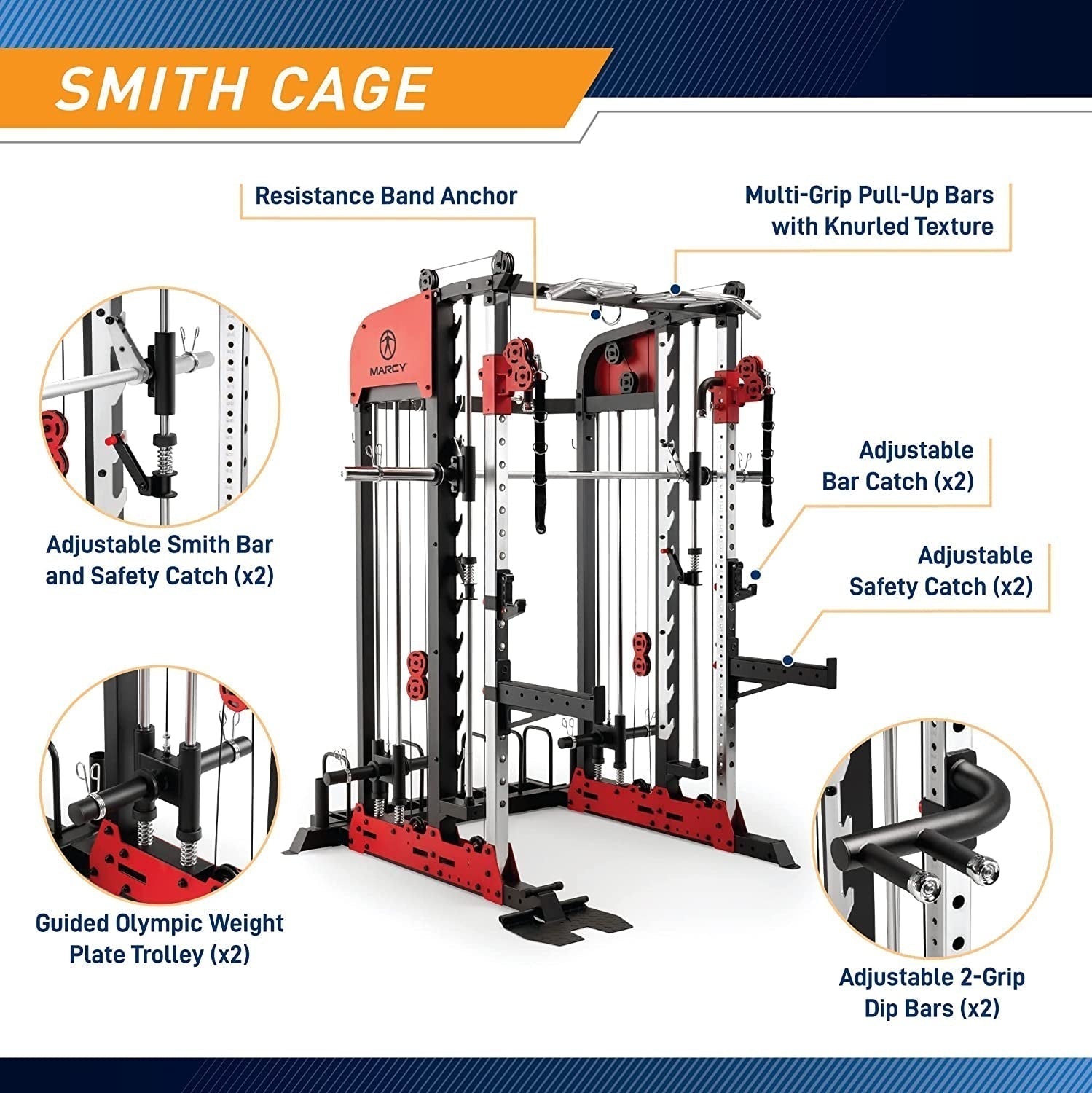 - DELUXE SMITH CAGE - The Marcy Pro Deluxe Smith Cage Home Gym System is a smith machine and power rack in one. Use the ultra-smooth chrome smith machine to safely workout on your own. And use the included bar catch / safety catches to complete squats, presses, and more.
