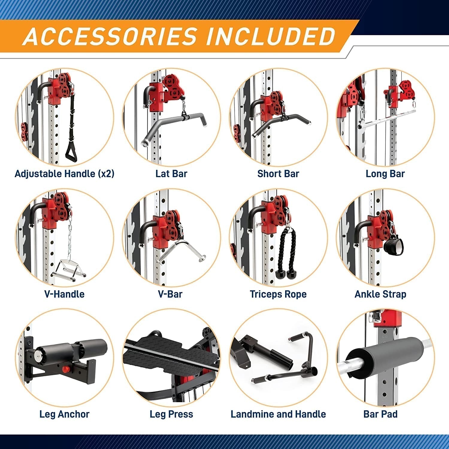 Use the included bar catch / safety catches for presses, squats and more. Complete leg presses using the leg press attachment and use the landmine attachment for several different landmine workouts including landmine squats, landmine rows, and more. Purchase resistance bands / tubes separately to use with the included anchor rods to add a different form of resistance to your workout, such as assisted or weighted pullup/dip exercises. The following included accessories ensure you can complete almost every exercise you can think of with the Marcy Deluxe Smith Cage Home Gym System – Lat Bar, Short Bar, Ankle Strap, V-Bar, V-Handle, triceps rope, and barbell pad.