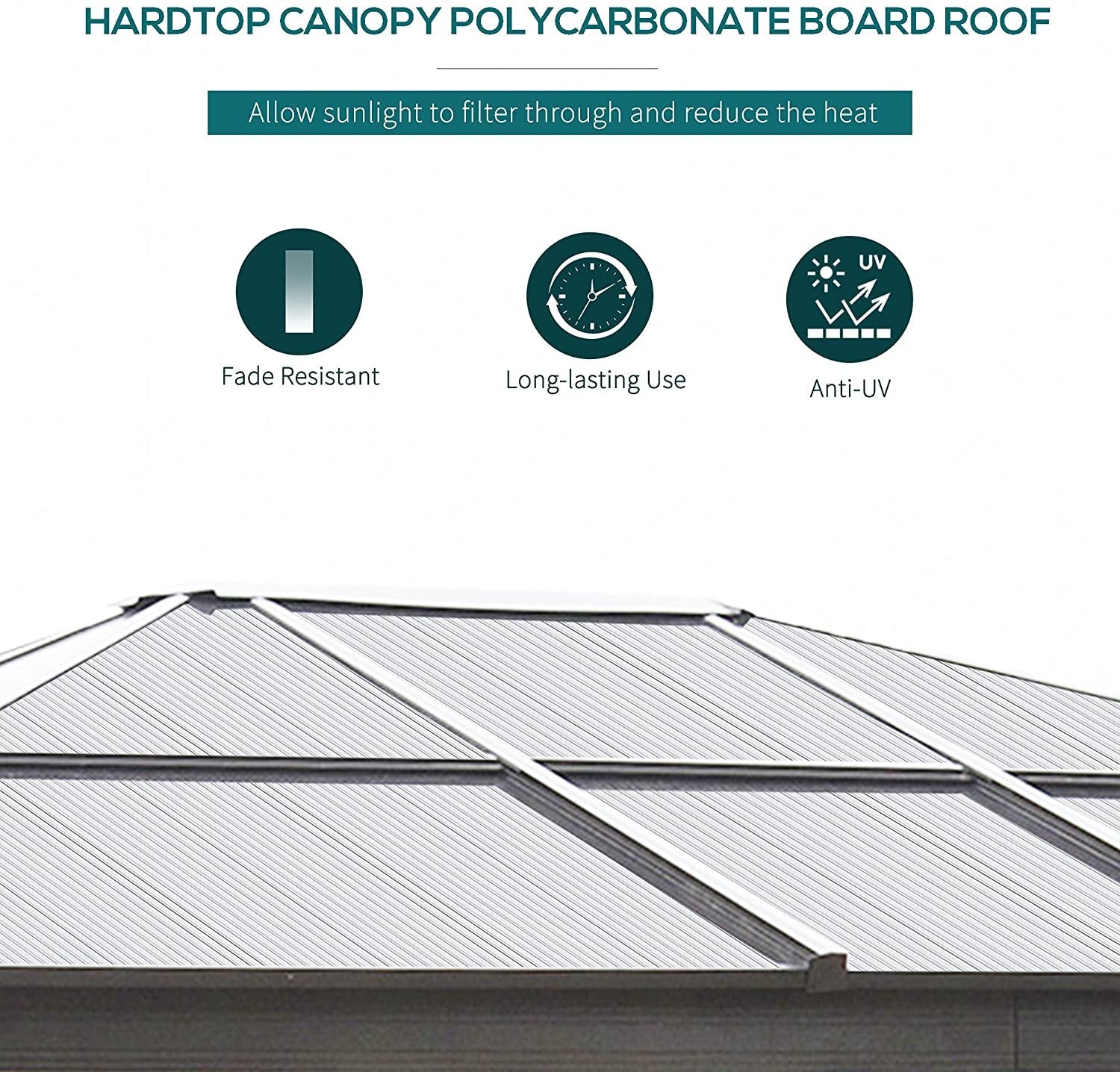 - Polycarbonate Roof : Our 10x12 hardtop gazebo's non-corroding polycarbonate roof provides your patio furniture with needed shelter from UV radiation and adds a modern charm to any backyard.