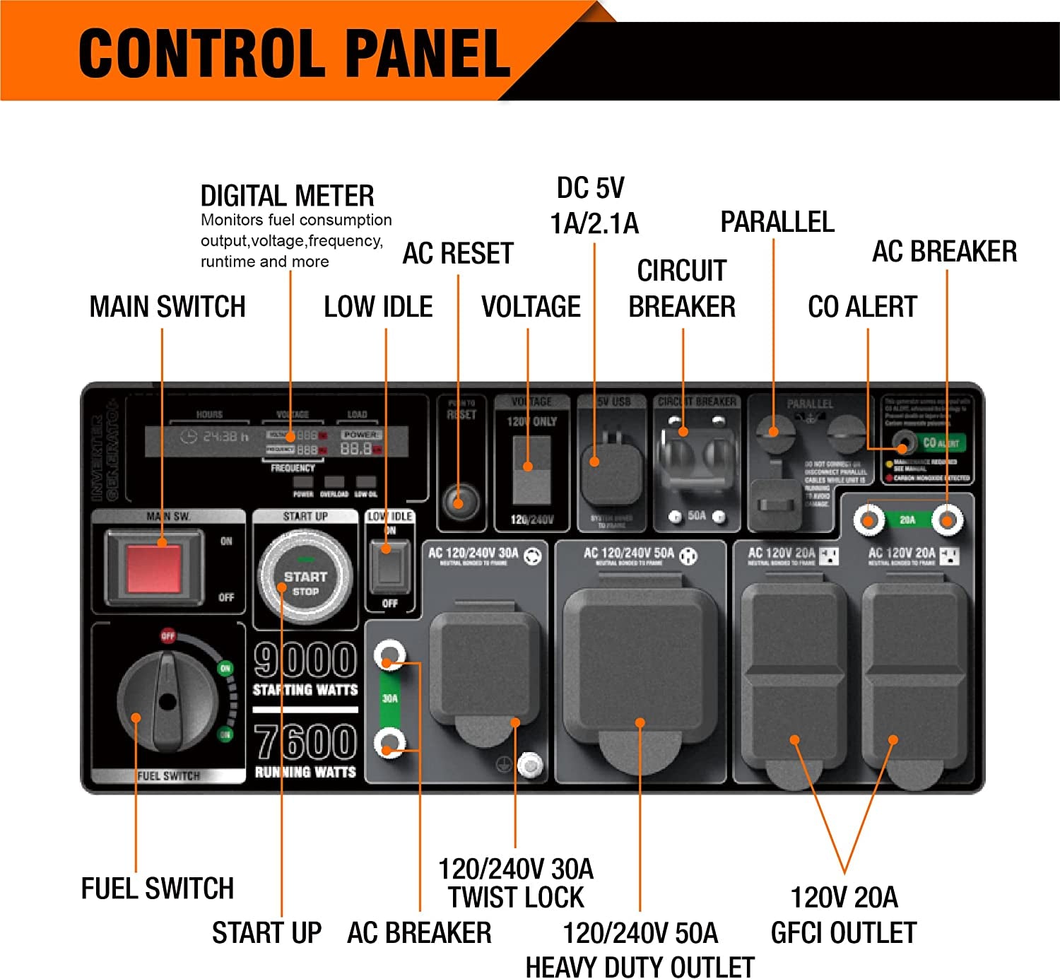 - 【Powerful Control Panel】The control panel includes a wide selection of outlets for maximum compatibility in your applications including: 4 120V household GFCI outlets, 1 120V 30A twist lock outlet, 1 120V/ 240V 50A outlet. lt also includes a dual 5V 1A/2.1A DC USB posts, voltage switch, low idle switch and one key start button.