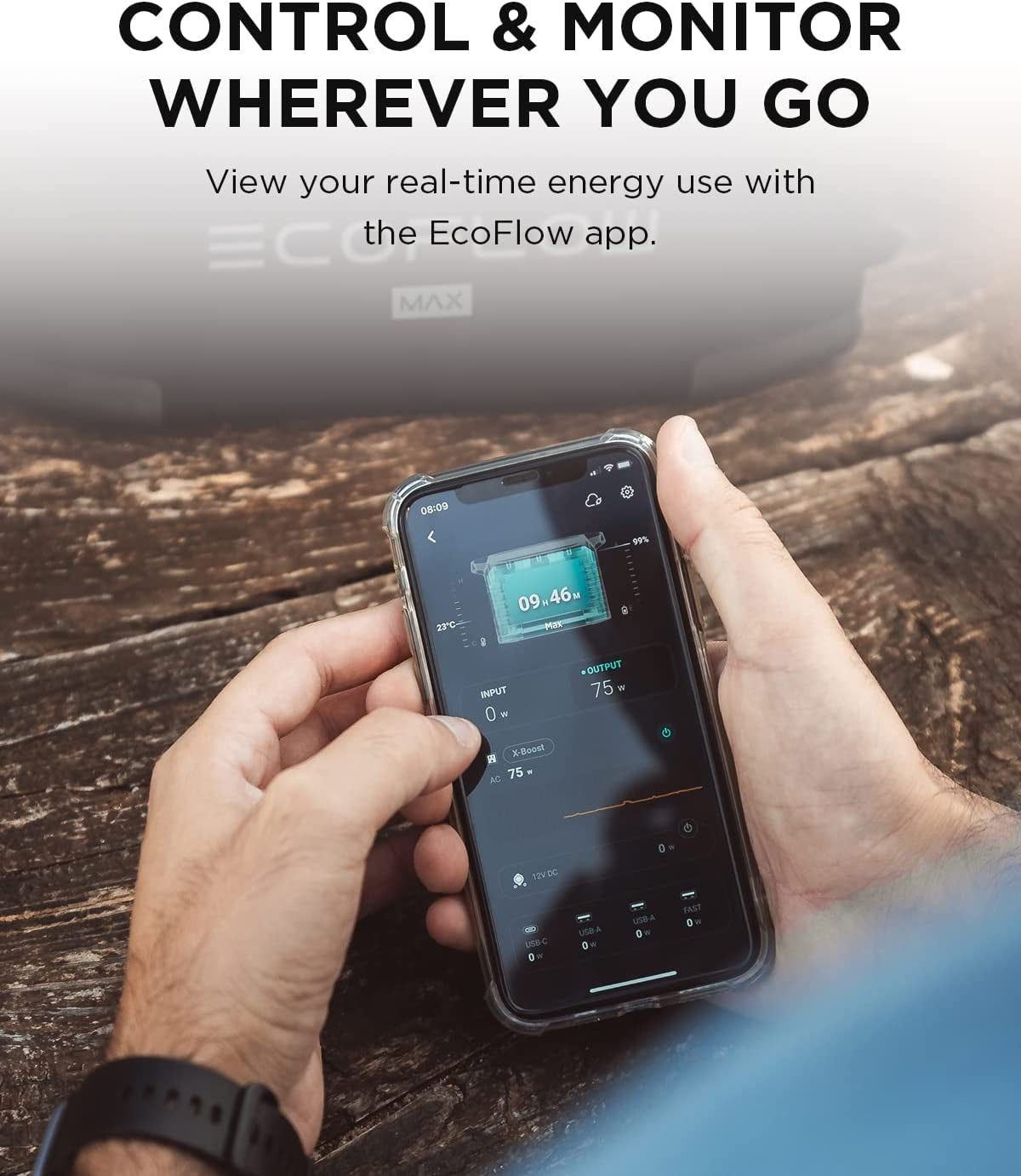 - Monitor & Control from the EcoFlow App. Take control of your DELTA Max and quick-view stats right from your phone. Customize settings such as charging speeds and Dual Fuel Generator auto-start levels to fit your power needs.