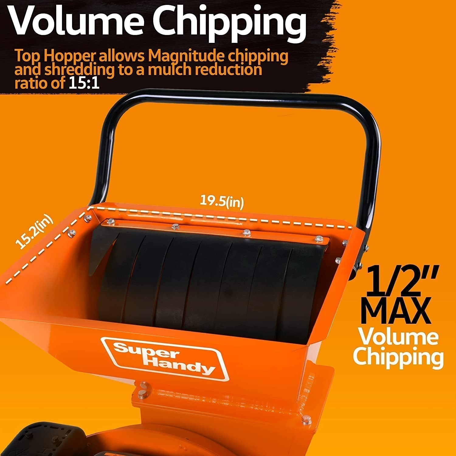 - MULTI-FUNCTION CAPABILITY; This 3-in-1 Wood Chipper Shredder Mulcher design has a Reduction Ratio of 15:1 when using the top Hopper for 1/2" MAX volume Chipping/Shredding; Side Chute for 3" MAX branch/limbs, or the attachable leaf vacuum for mulching