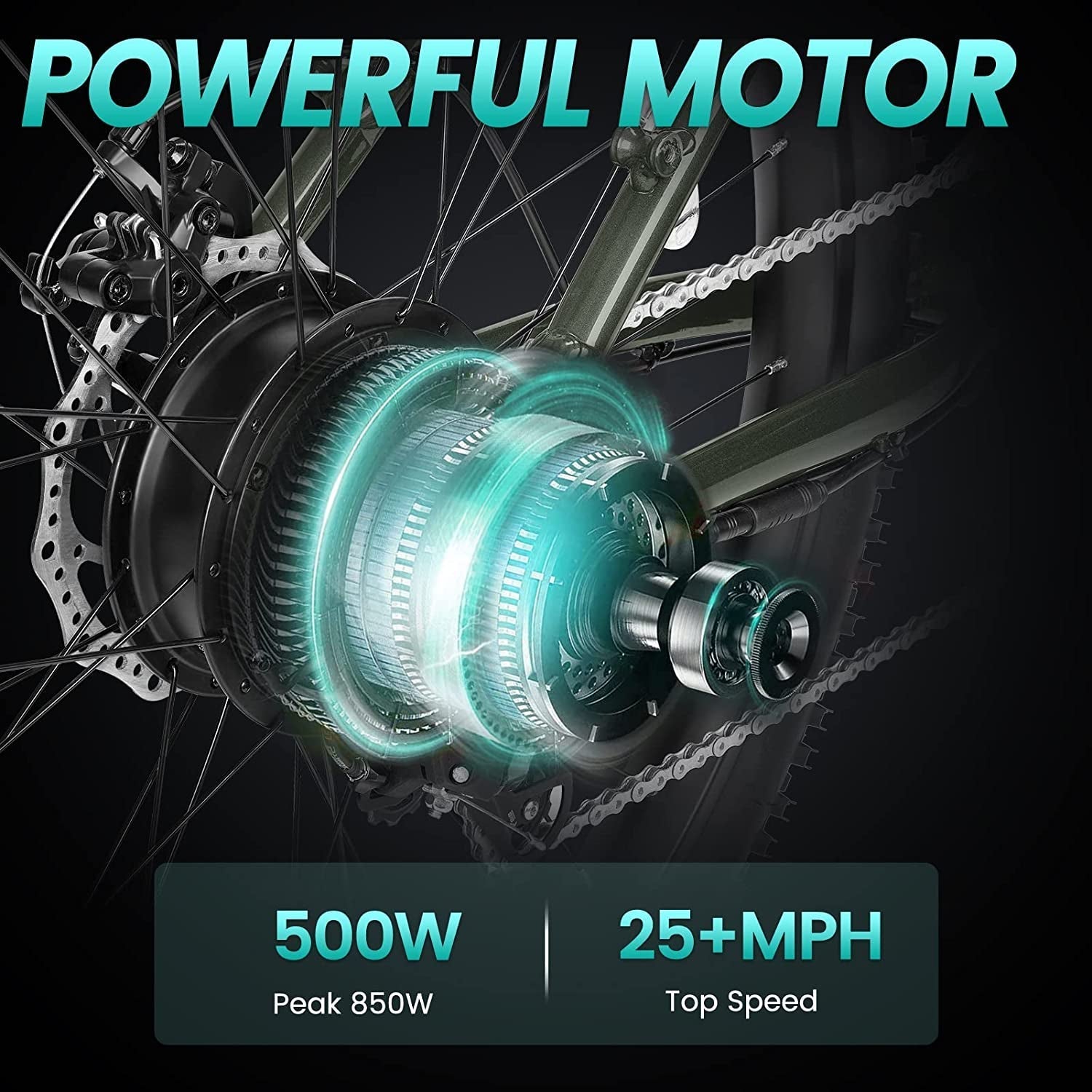 - [Powerful Brushless Motor] It equips with 500W high speed brushless motor, provides strong power and climbing capabilities for the electric bicycle. And so made it speed up to 25 mph. Applicable to all terrains, whether for city road or mountains. It takes you freely to anywhere you desire.