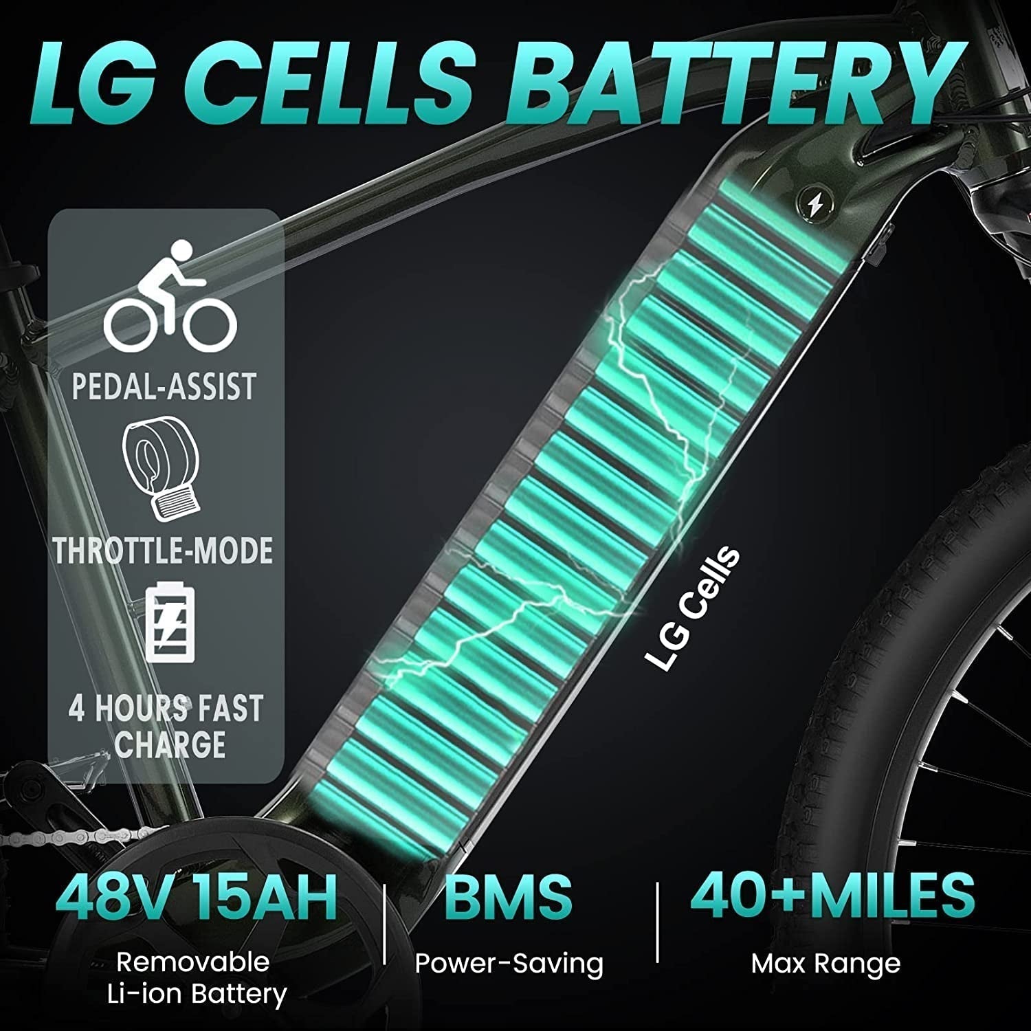 - [Large Brand Capacity Battery] It comes with LG 48V 15AH larger battery with larger LG cells which makes longer using lifetime. It also offers ebike longer riding range and assists traveling up to 40+ miles with per full charge. The battery is hidden in the frame with double lock mechanism secured for anti-theft and avoids drop-out during furious riding. It's also removable for charging.
